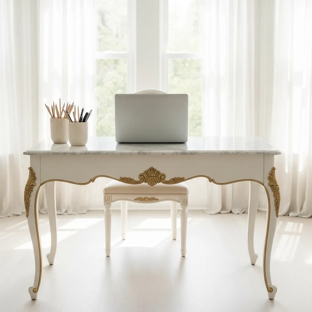 Your desk is the heart of your office, so make it a centerpiece. I adore a white or light wood desk with elegant curves or cabriole legs. A vintage-inspired writing desk can add instant charm.