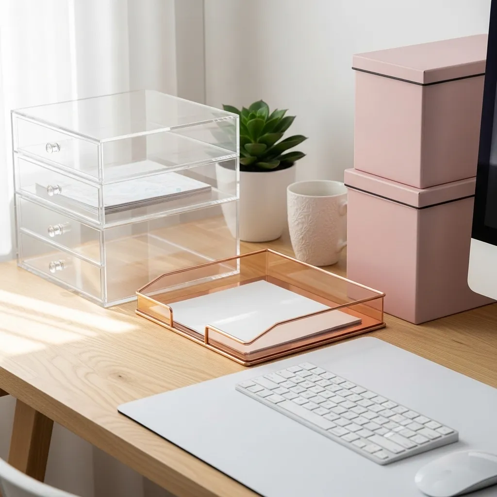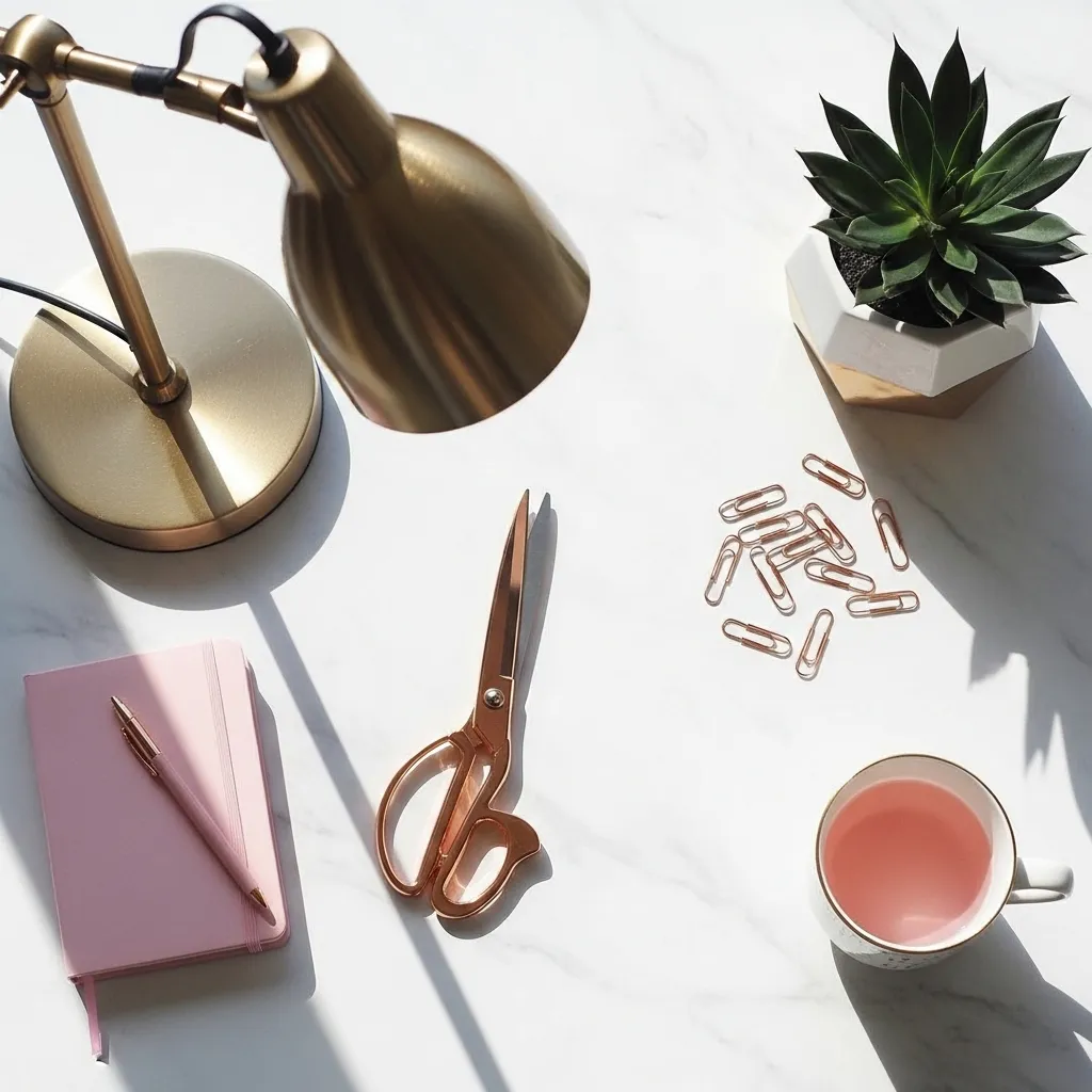 Organization doesn’t have to be boring! Corral your supplies in decorative boxes, patterned bins, or clear acrylic containers with gold accents. Use a beautiful ceramic mug for pens, a jewelry dish for paperclips, and a tiered tray for sticky notes and staples.