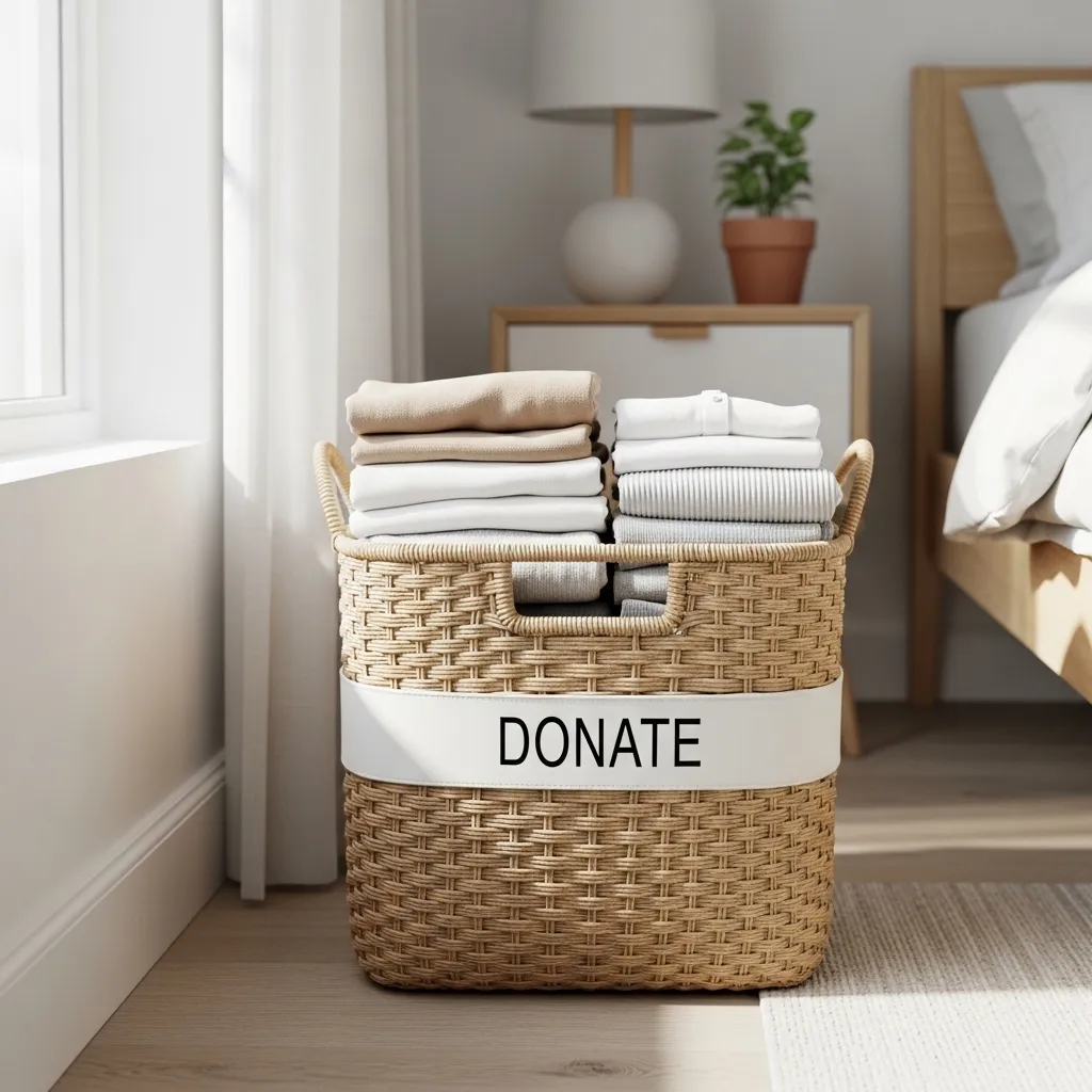 Instead of letting unwanted clothes pile up in a corner of the closet, I keep a small, attractive bin or bag in my closet or bedroom corner.