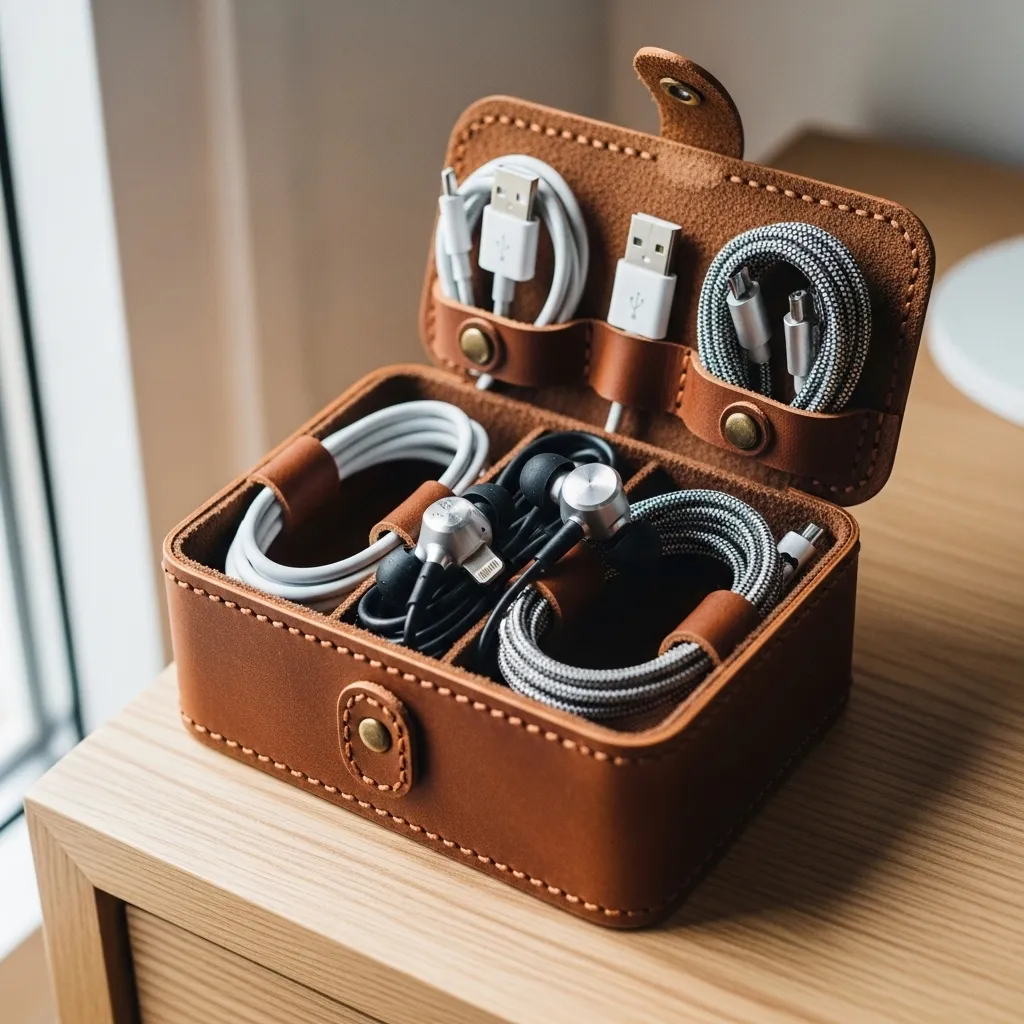 Thread the charging cord through it to keep it neatly in place and prevent it from slipping behind the furniture. For a bigger setup, a small power strip with a short cord can consolidate plugs neatly.