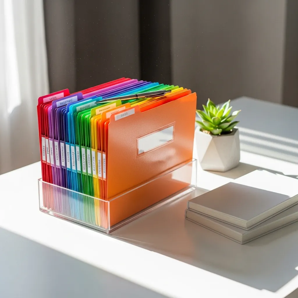 Ditch the boring manila! I swapped all my standard office supplies for colorful, patterned file folders and binders. Organizing by color (e.g., blue for finances, green for projects) not only looks cheerful on my shelves but also helps me find things in a flash.