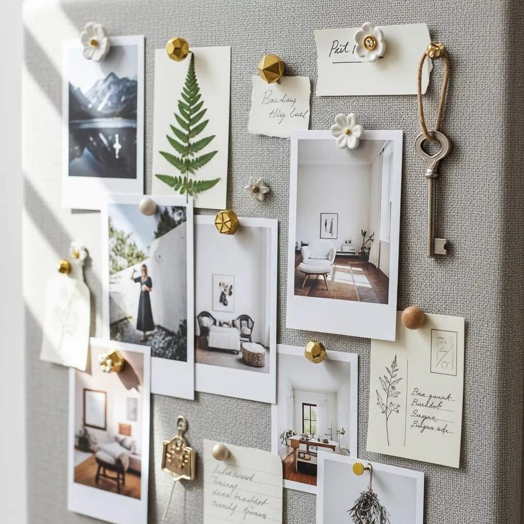 Instead of a standard corkboard, I stretched a pretty fabric over a canvas frame and secured it with a staple gun. Now I have a beautiful, textured backdrop for pinning inspiration photos, important notes, and cute postcards.