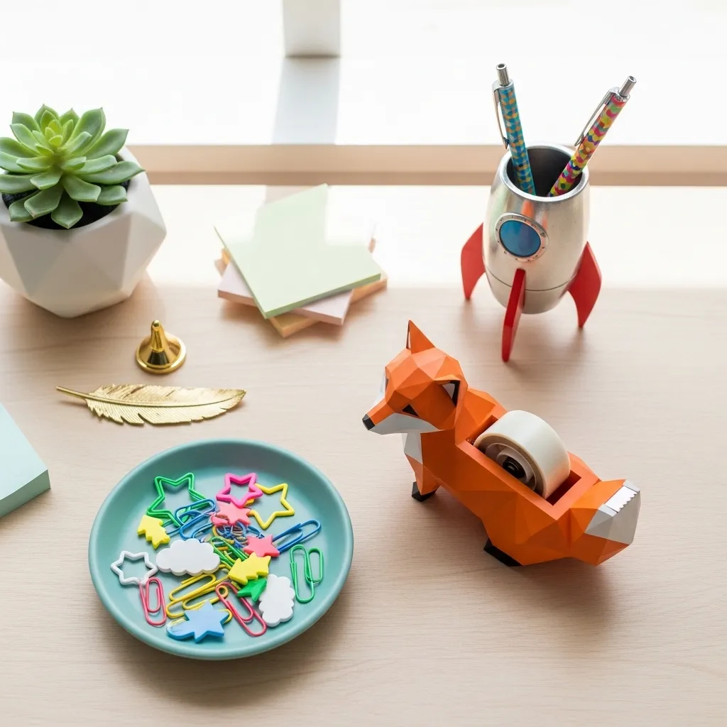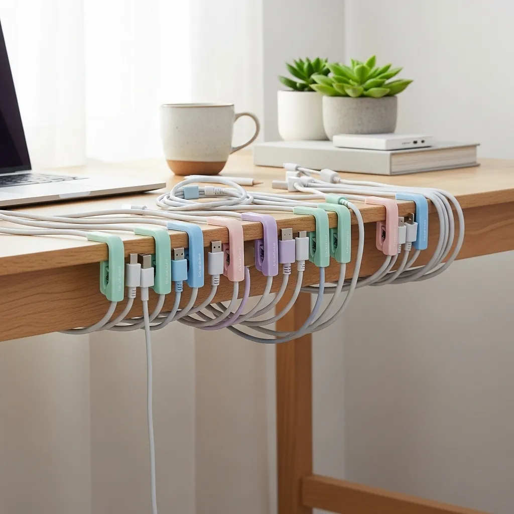 Cables are the ultimate eyesore. I got serious with cute solutions: using patterned washi tape to secure cords to the desk back, tucking them into pastel-colored cable sleeves, and using adorable animal-shaped cord clips.
