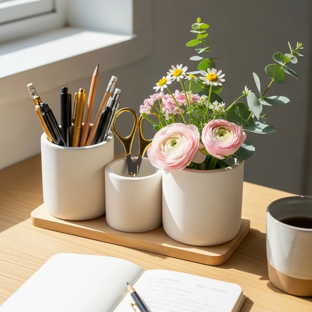 A> Immediately swap out your pen holder for a pretty mug or vase and add one small plant or succulent. It takes two minutes and changes the whole feel of your desk.