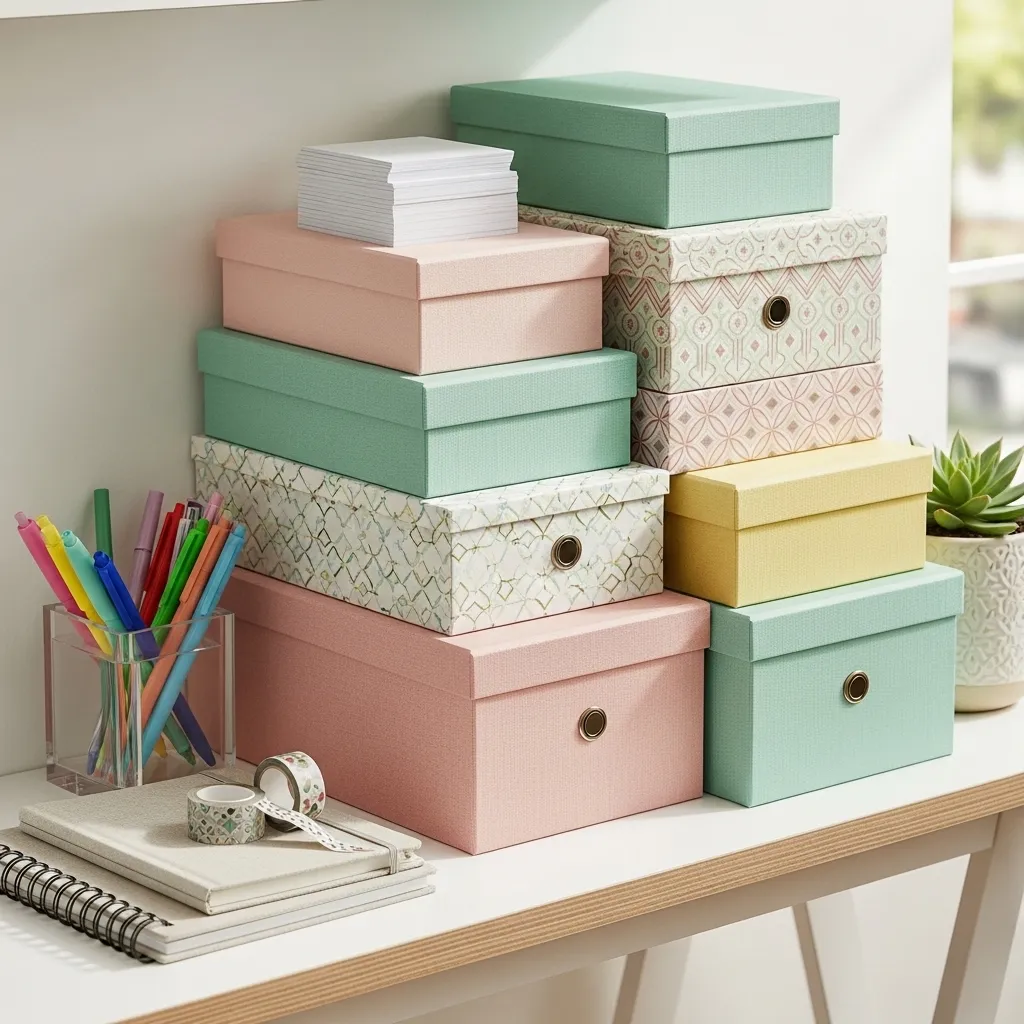 We all have stuff we need to stash. My solution? Pretty storage boxes on open shelves. I use patterned fabric boxes, woven seagrass bins, or even decorated shoeboxes to hide notebooks, supplies, and cables.