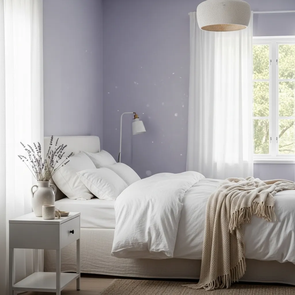 For the ultimate peaceful haven, pair soft lavender walls with lots of crisp, white linen. Think airy bedding, sheer curtains, and a fluffy rug. This combo feels light, fresh, and endlessly calming.
