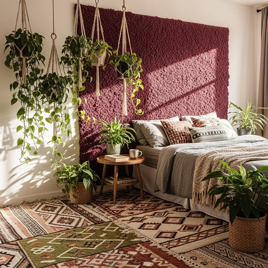 Embrace a rich, berry-toned purple in a boho scheme. Layer different textures: a deep purple velvet pillow, a fuzzy magenta rug, and a patterned kilim blanket.