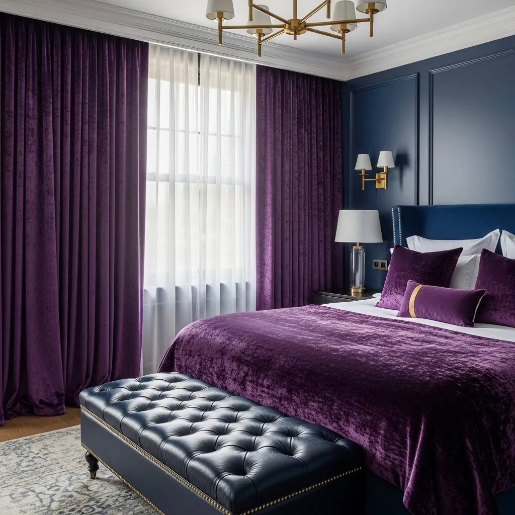 Create a regal, grounded feel by pairing a royal purple with deep navy blue. It’s a classic, masculine-leaning combo that feels incredibly rich and cozy.