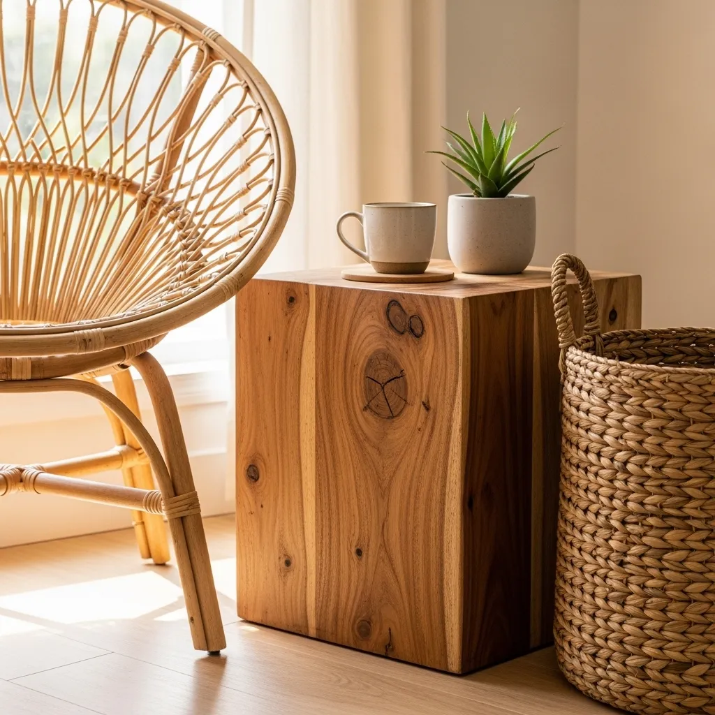 Boho style has a deep connection to nature. I bring in materials like rattan, wicker, bamboo, and wood. A rattan peacock chair, a wicker basket for blankets, or a simple bamboo tray on the coffee table adds warmth and earthiness. These elements balance out brighter colors and patterns beautifully.