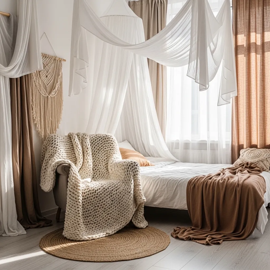 Soft, flowing fabrics add instant romance and soften hard edges. I’ll drape a lightweight tapestry or a pretty scarf over a dull headboard. A sheer canopy over the bed corner or some gauzy curtains that pool lightly on the floor can make a small bedroom feel like a dreamy retreat.