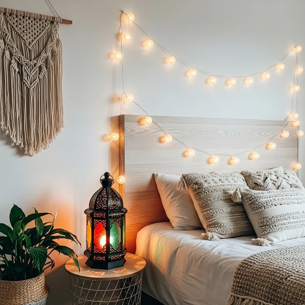 Boho lighting is all about creating a warm, ambient glow. I weave fairy lights through my macramé wall hanging or drape them in a glass jar for a DIY lantern. A Moroccan metal lantern with a candle (or LED candle for safety) on a side table adds a magical, twinkling atmosphere in the evenings.