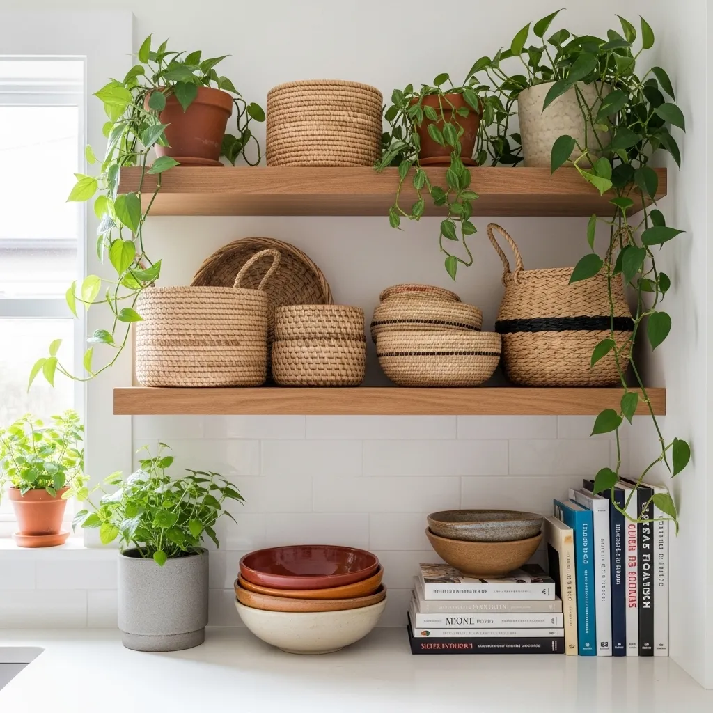 Open shelves in the kitchen or living area are a great boho opportunity. I style them with a mix of practical and pretty: stack my favorite bowls, add a trailing plant, lean a small piece of art, and keep my go-to cookbooks handy. It keeps things functional but feels like a curated display.