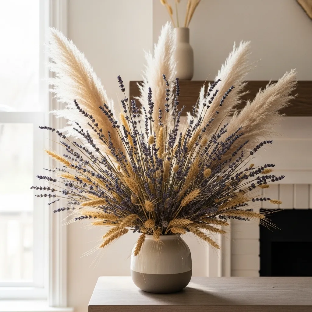 For texture and earthy color that lasts all season, I’m obsessed with dried florals. Pampas grass, bunny tails, or dried lavender add incredible height and softness. Arrange them in a neutral ceramic vase for a modern touch.