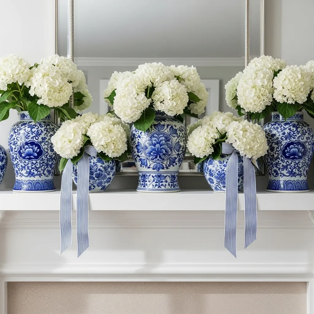 This timeless combination always feels crisp and summer-ready. I gather my blue and white pottery—ginger jars, vases, or plates—and arrange them in a balanced grouping.
