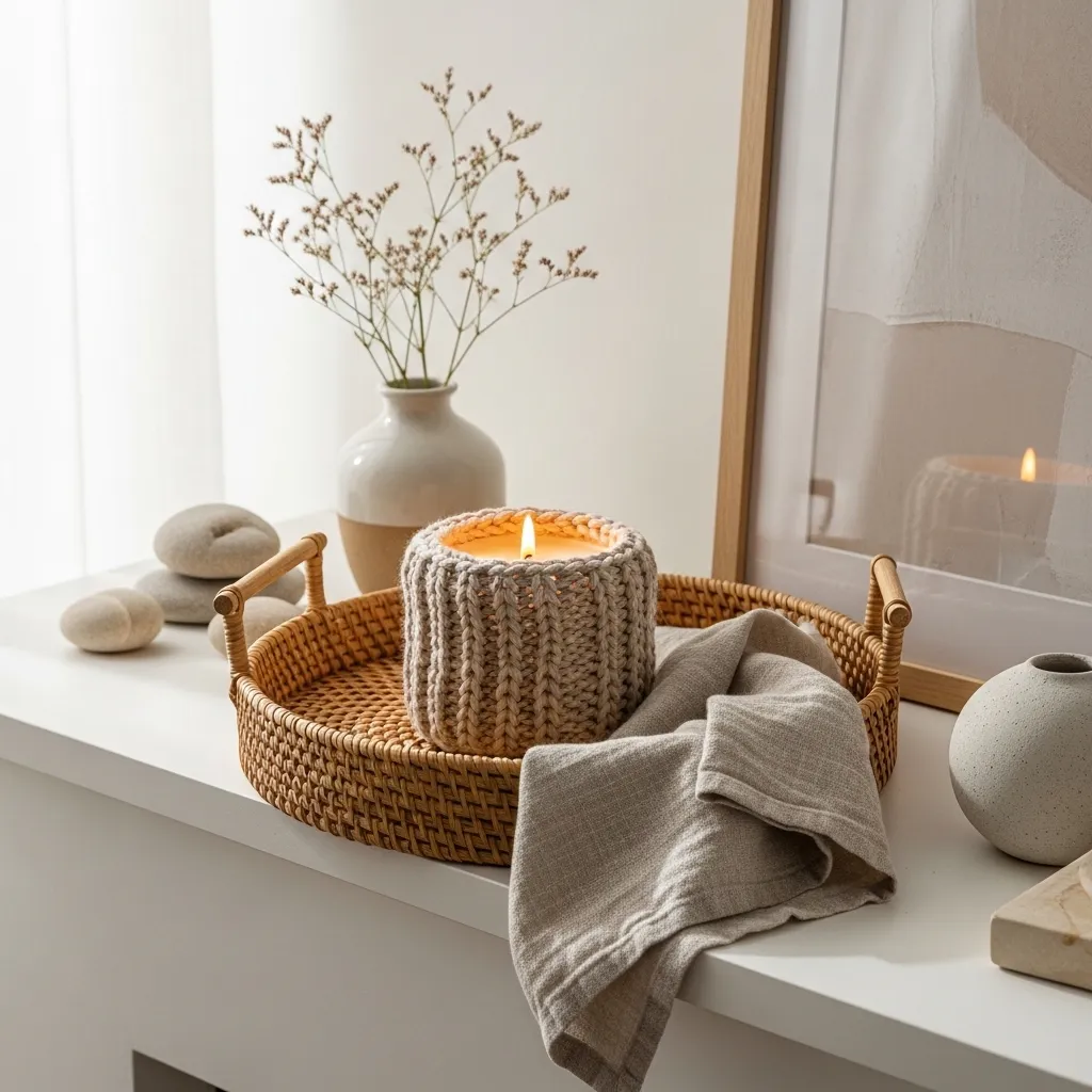 I add warmth and tactility with natural woven materials. A rattan tray as a base, a seagrass basket laid on its side, or a small wicker fan adds instant texture.