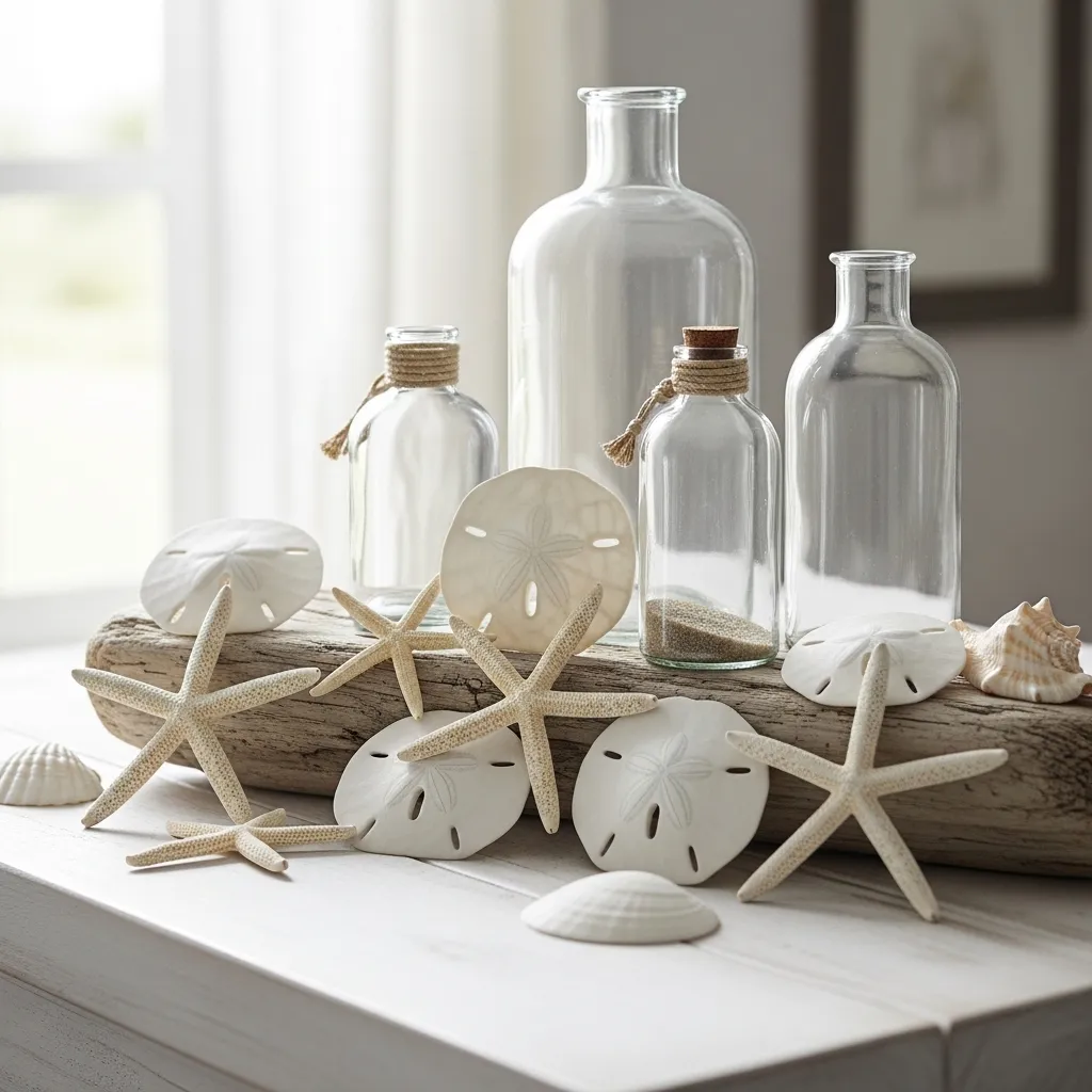 Focus on a collection of beautiful natural finds. Arrange a few starfish, sand dollars, and pieces of driftwood in a sculptural way. I often place them on a bed of neutral sand or pebbles in a shallow dish.